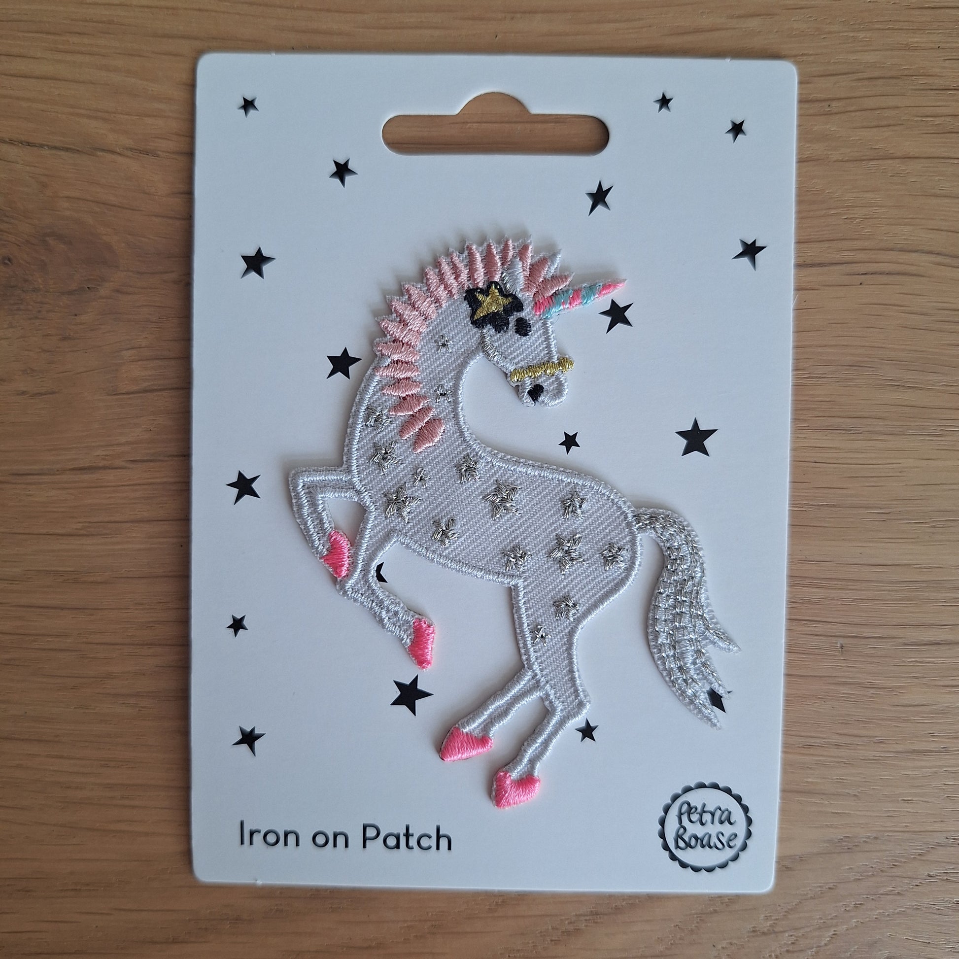 Het unicorn strijkembleem bevat roze hoeven, roze manen, sterretjes (met glitters) en een gekleurde hoorn. Gemaakt door Creative Studio Petra Boase.