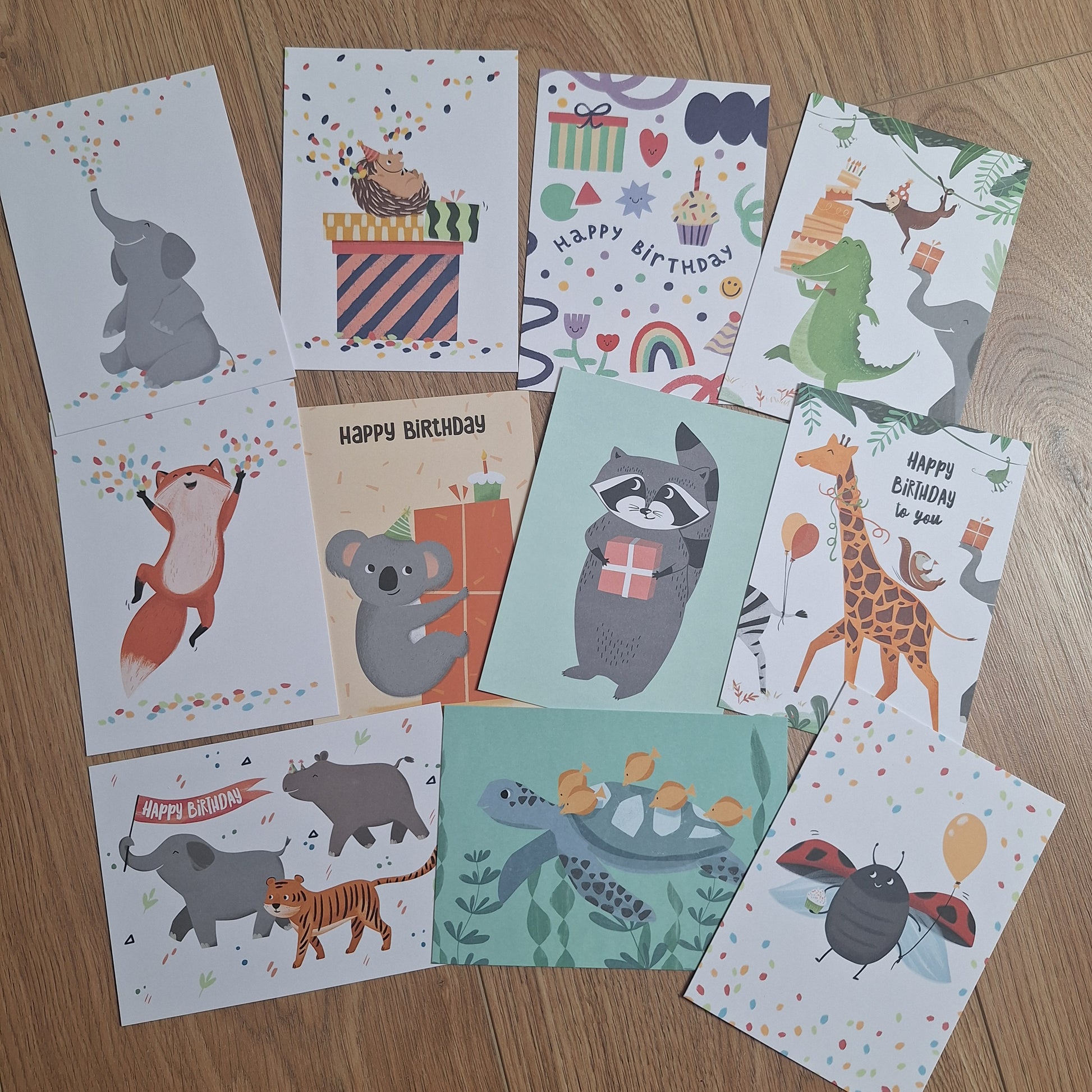 Altijd een verjaardagskaart voor kinderen in huis. Met deze verjaardagskaarten set van maar liefst 11 ansichtkaarten ben je altijd goed voorbereid. De verjaardagskaarten set bevat ansichtkaarten met wilde dieren, confetti en algemenere kaarten die je ook 'zomaar' kunt gebruiken.